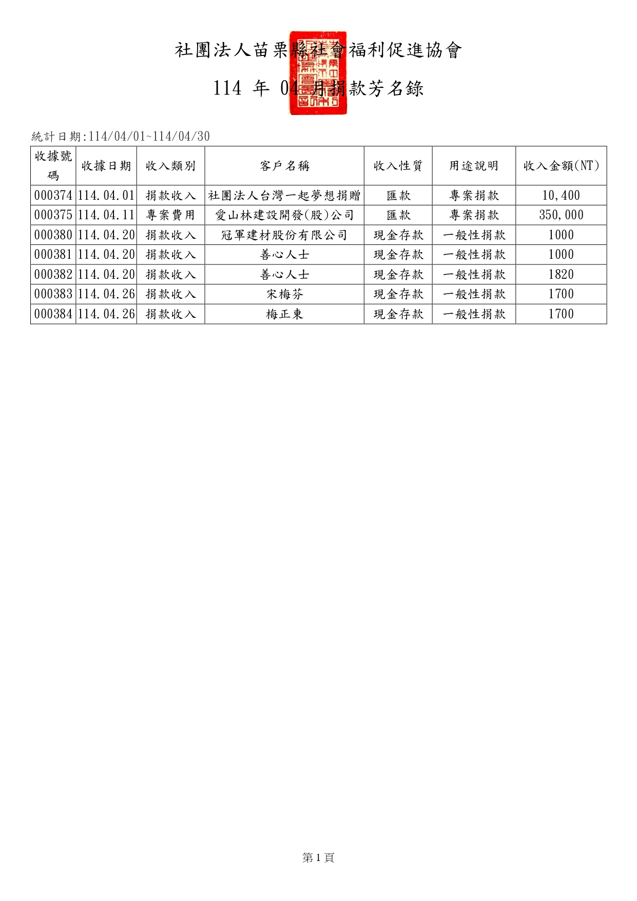 2025年4月 捐款芳名單